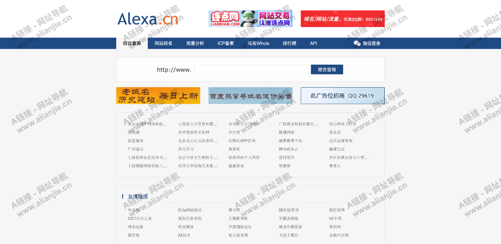 Alexa网站流量全球综合排名查询。免费提供Alexa网站流量排名官方数据查询,中文网站排行榜,官方网站ICP备案信息查询,域名注册信息查询,网站访问量查询,网站浏览量查询,网站排名变化趋势数据每日更新。