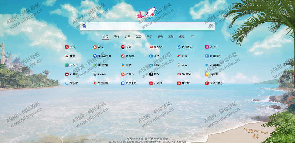 咪咕鱼网址导航是一个简洁、清新、好用的上网导航网站。在这里你可以自定义网址和分类,选择最适合你的背景和布局,设置喜欢的搜索引擎,帮助你快速地上网冲浪,找到想要的网站和信息。