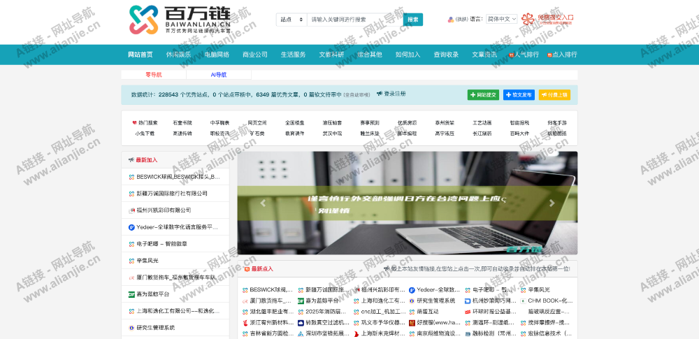 百万链(baiwanlian.cn)是自动审核并免费收录各类优秀网站的中文网站目录,根据行业分类提供行业网站目录检索,旨在为网友和搜索引擎提供参考,是站长免费推广网站的最佳平台!
