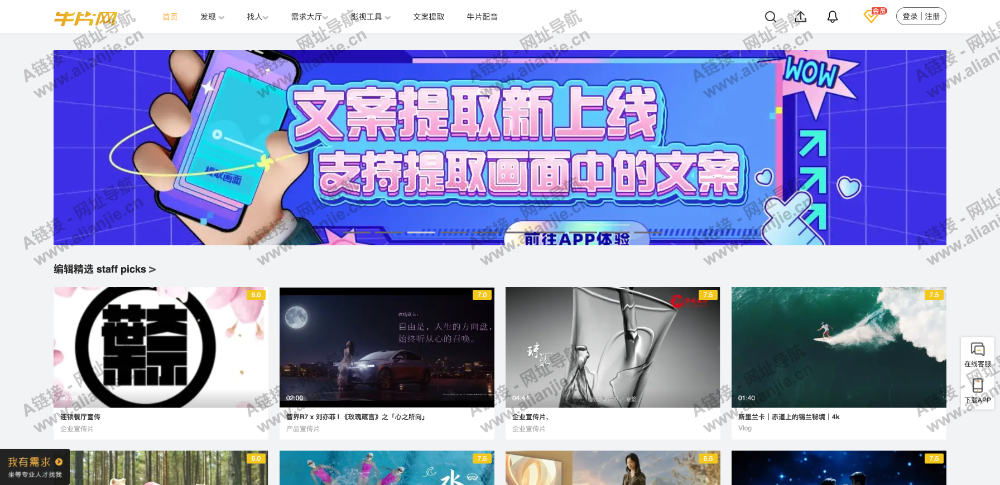 牛片专注影视广告资源整合,影视公司提供宣传片样片报价,广告片文案脚本策划,短视频拍摄,企业宣传片制作;创作人提供视频制作,mg动画,flash动画,3d三维动画制作;平台为兼职摄影师,后期制作剪辑师提供威客订单,免费配音软件,智能字幕,影视培训,专业效率工具等!