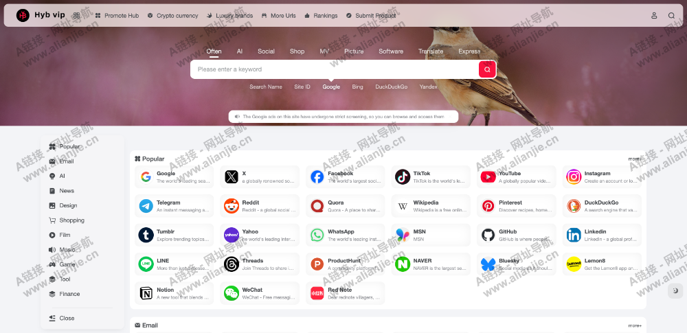 Hyb is a popular URL navigation website with categories like Popular, Email, AI, News, Design, Store, Movies, Music, Games, Tools, and more.