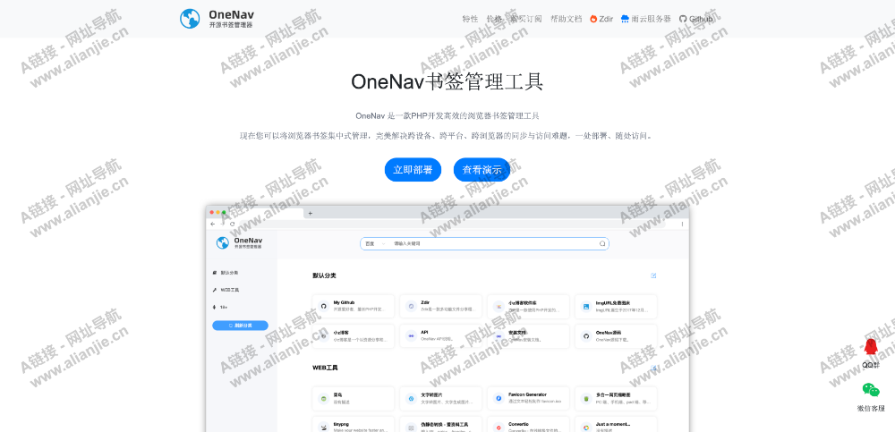OneNav是一款开源免费的书签(导航)管理程序,由xiaoz使用使用PHP + SQLite 3开发,界面简洁,安装简单,使用方便。OneNav可帮助你你将浏览器书签集中式管理,解决跨设备、跨平台、跨浏览器之间同步和访问困难问题,做到一处部署,随处访问。