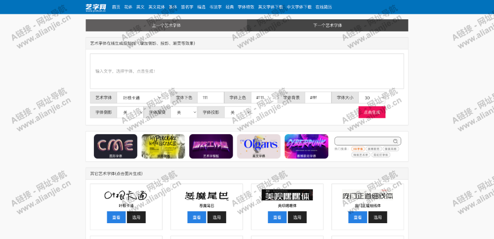 艺术字体在线生成把优秀的字体通过渐变、投影等艺术化处理的字体网站,提供上百种艺术字体转换,目的是让更多人了解中国汉字艺术!