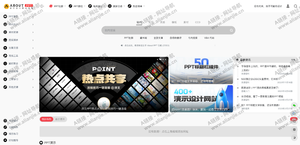 AboutPPT导航,PPT设计师的网址导航,专注于PPT设计教程与网站神器分享,收录了高质量且系统的PPT学习文章与教程,aboutppt还提供了海量PPT设计素材与资源合集免费下载,能够看到国内外高水平设计师的PPT作品与源文件。