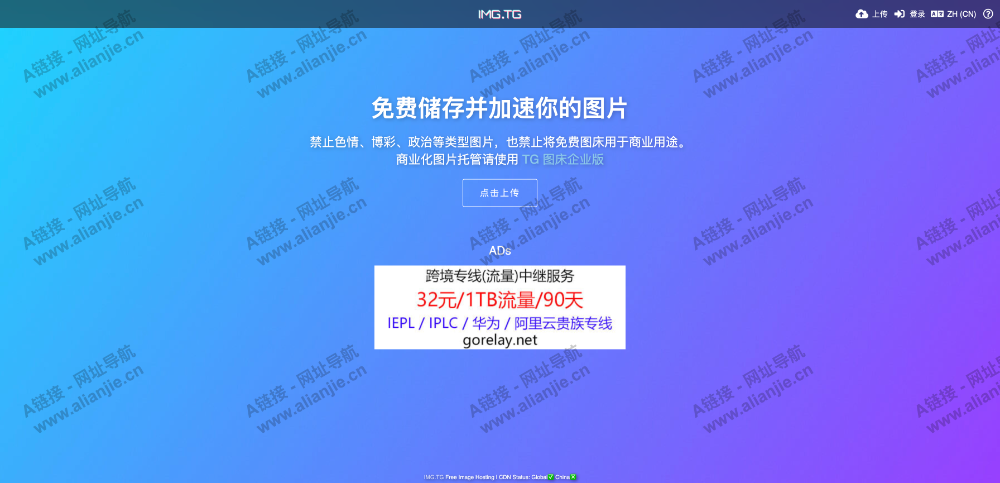 TG 图床 (imgtg.com) 的免费版,包含国际 CDN 的永久免费图床,毫秒级的访问体验,异地备份并永久保存在云端。