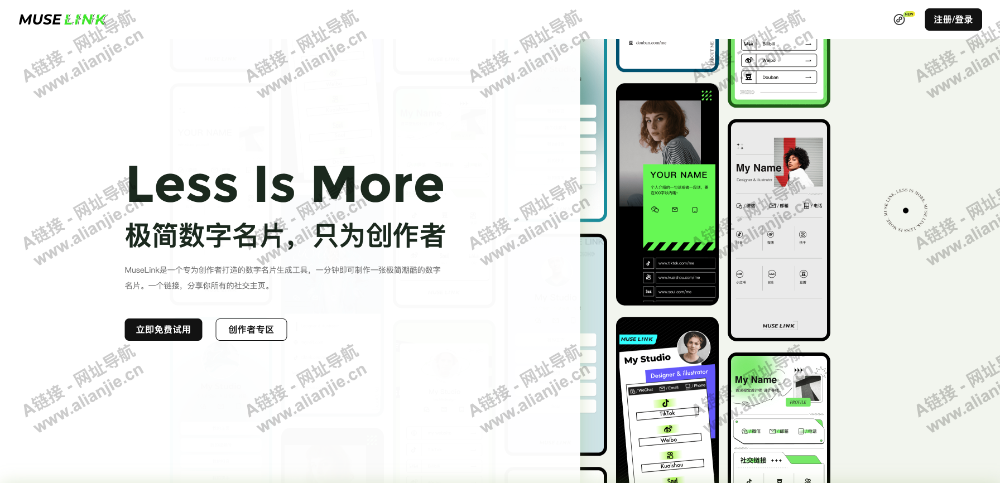 MuseLink是一个专为创作者打造的数字名片生成工具,一分钟即可制作一张极简潮酷的数字名片。一个链接,分享你所有的社交主页。