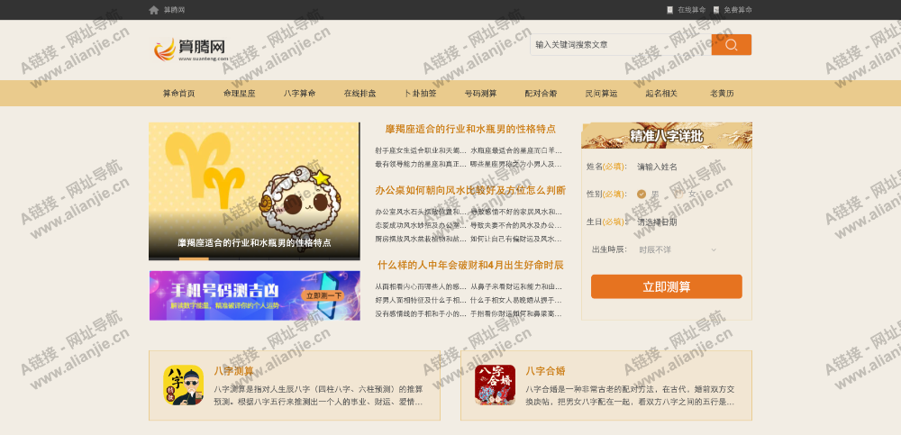 算腾网是一个专业的免费算命平台,汇集了八字算命、排盘、合婚,姓名、星座分析,卜卦抽签,号码吉凶测算,在线起名,以及星座配对和公司名字分析等众多功能于一身。算腾网致力于传承中华传统文化,汇聚了丰富的八字百科知识,在这里,可以随时查看最新的算命杂谈、星座百科,了解不同星座的特点和相处之道。算腾网,集传统命理与现代科技于一体的综合性算命网站,在线为广大用户提供最全面、最精准的算命服务。