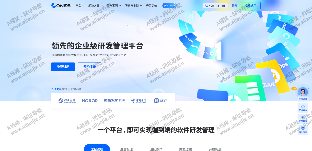 ONES 是一个企业级研发管理平台,覆盖流程管理、进度管理、团队协作、效能改进等各类研发管理场景,实现端到端的软件研发管理,更懂中国企业的研发管理痛点。
