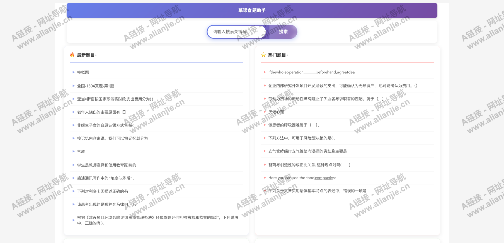 慕课搜题助手于2025-10-13收录在本站。收录时,此站可正常访问且未发现明显的违法违规信息,后期该网站若出现违法违规信息与本站无关。由于互联网域名的租赁属性以及公开信息的不确定性,若该网站后期不可访问或出现了违法信息,可联系本站,我们将第一时间屏蔽!