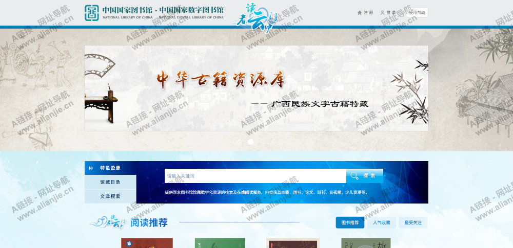 读者云门户使用帮助登录注册特色资源馆藏目录文津搜索 提供国家图书馆馆藏数字化资源的检索及在线阅读服务,内容涵盖古籍、图书、论文、期刊、音视频、少儿资源等。 提供国家图书馆馆藏实体文献资源的检索和借阅服务。 提供国家图书馆自建和外购资源统一的元数据搜索服务。图书推荐人气收藏最受关注猛将还乡谷物的故事碌碌有为故园惊梦书籍秘史最后的观星人昆虫记创新者的世界汉字就是这么来的街上的马少年与海砂粒与星尘我们住