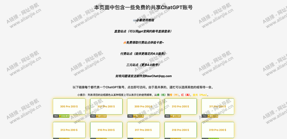 RawChat公益站点本页面中包含一些免费的共享ChatGPT账号📖必看使用教程直登站点(可以用gpt官网的账号直接登录)🔥免费领取付费站点体验卡密~付费站点(提供更稳定的4.0服务)三元站点(更多4.0账号)如有问题请发送邮件到[email protected]以下链接每个都代表一个ChatGPT账号,点击即可访问。由于是共享的,遇忙可以选择其他的或等待一会。小提示:列表项目的边框颜色从某种程度